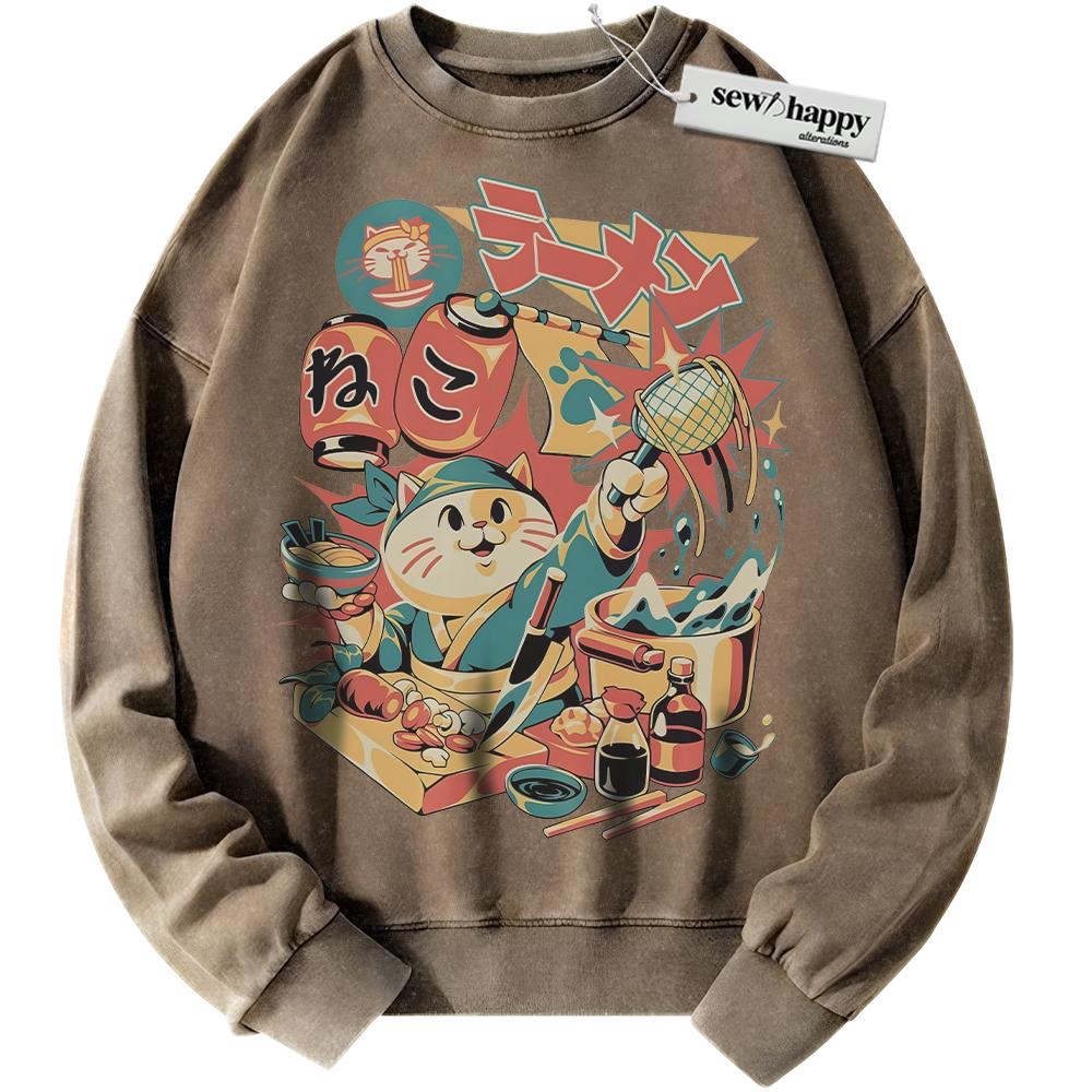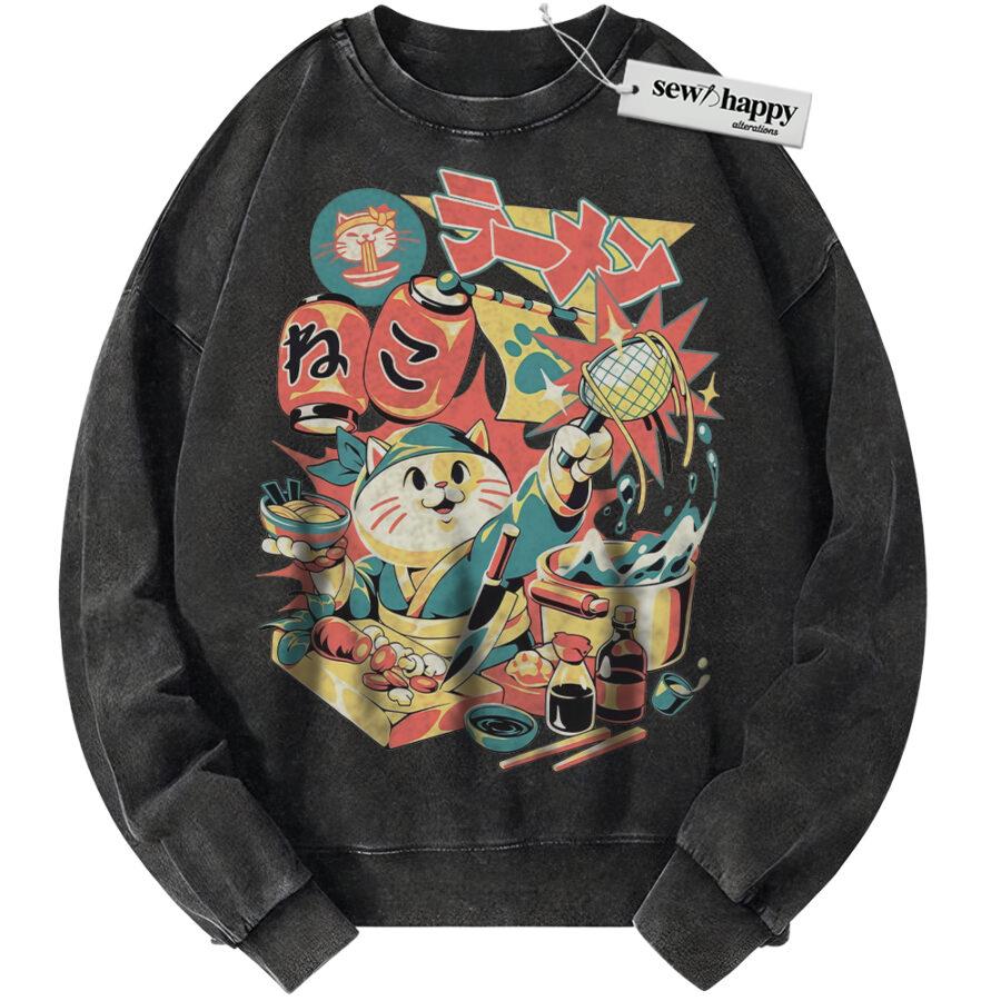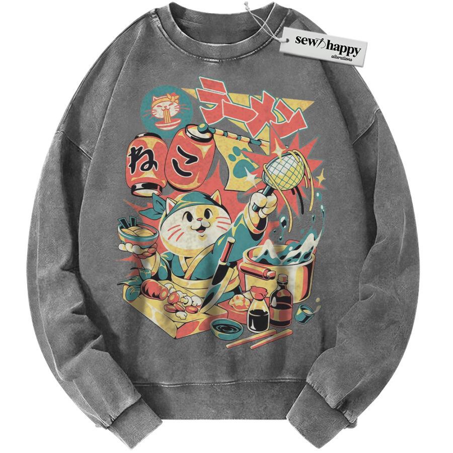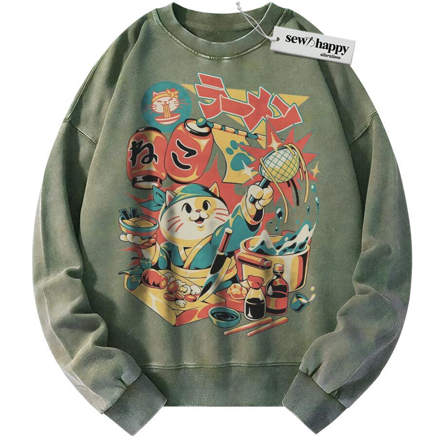 Wash Sweatshirt Neko Ramen Cat Sweatshirt, Japanese Streetwear Sweatshirt, Vintage Sweater
