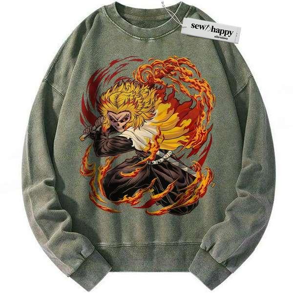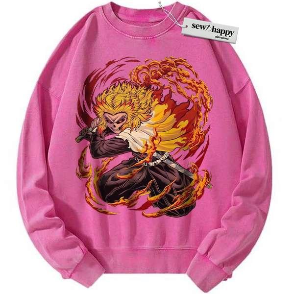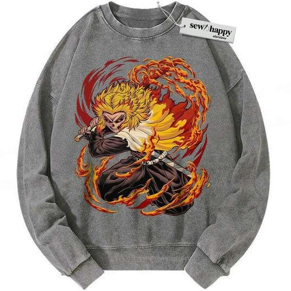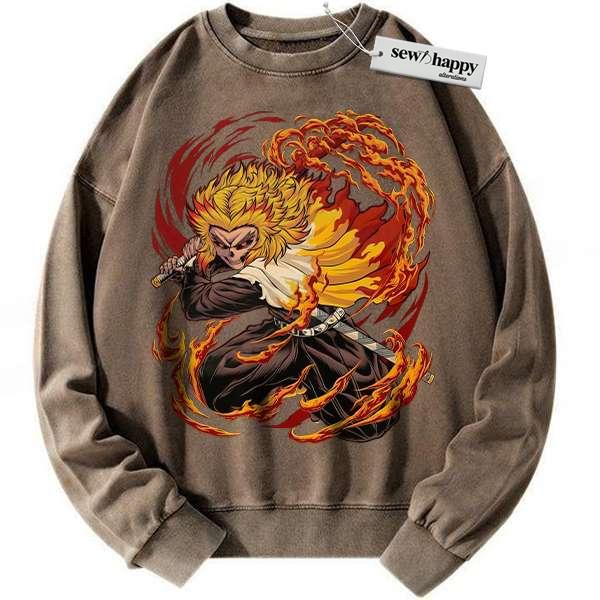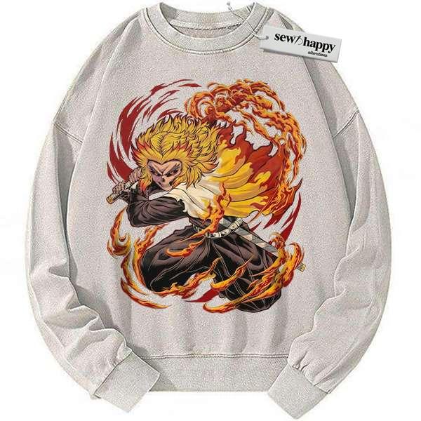 Wash Sweatshirt Skull Kyojuro Rengoku Sweatshirt, Demon Slayer Sweatshirt, Anime Sweatshirt, Vintage Sweatshirt