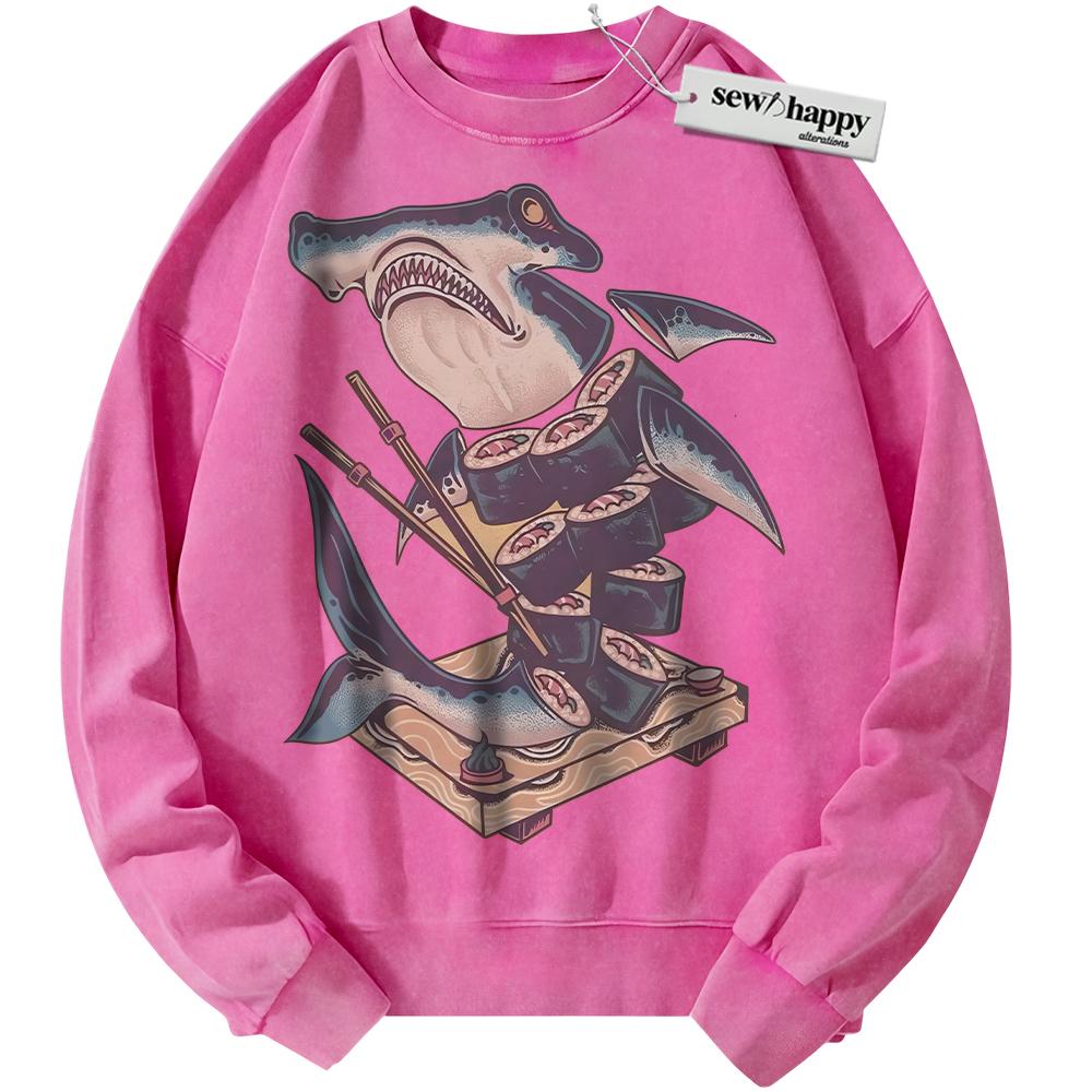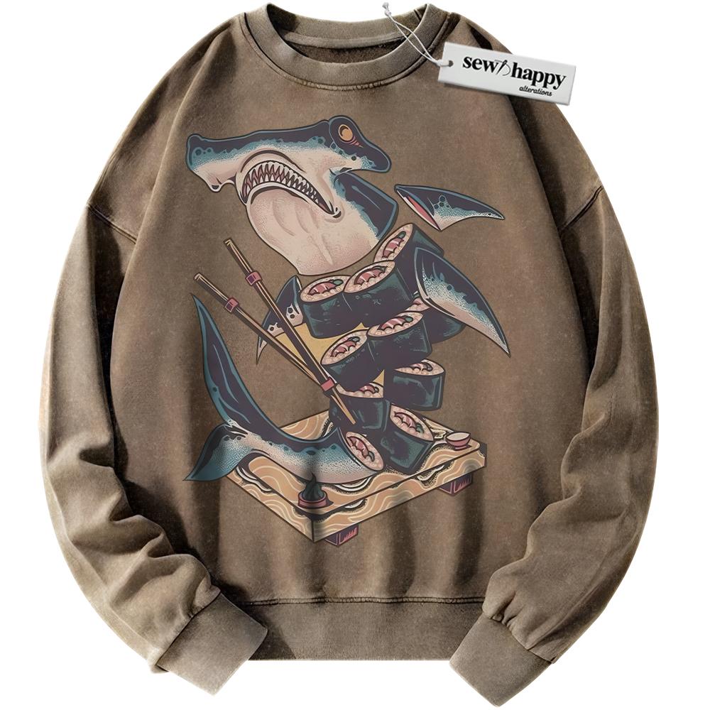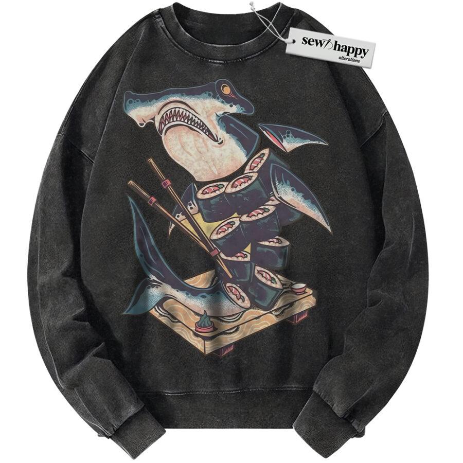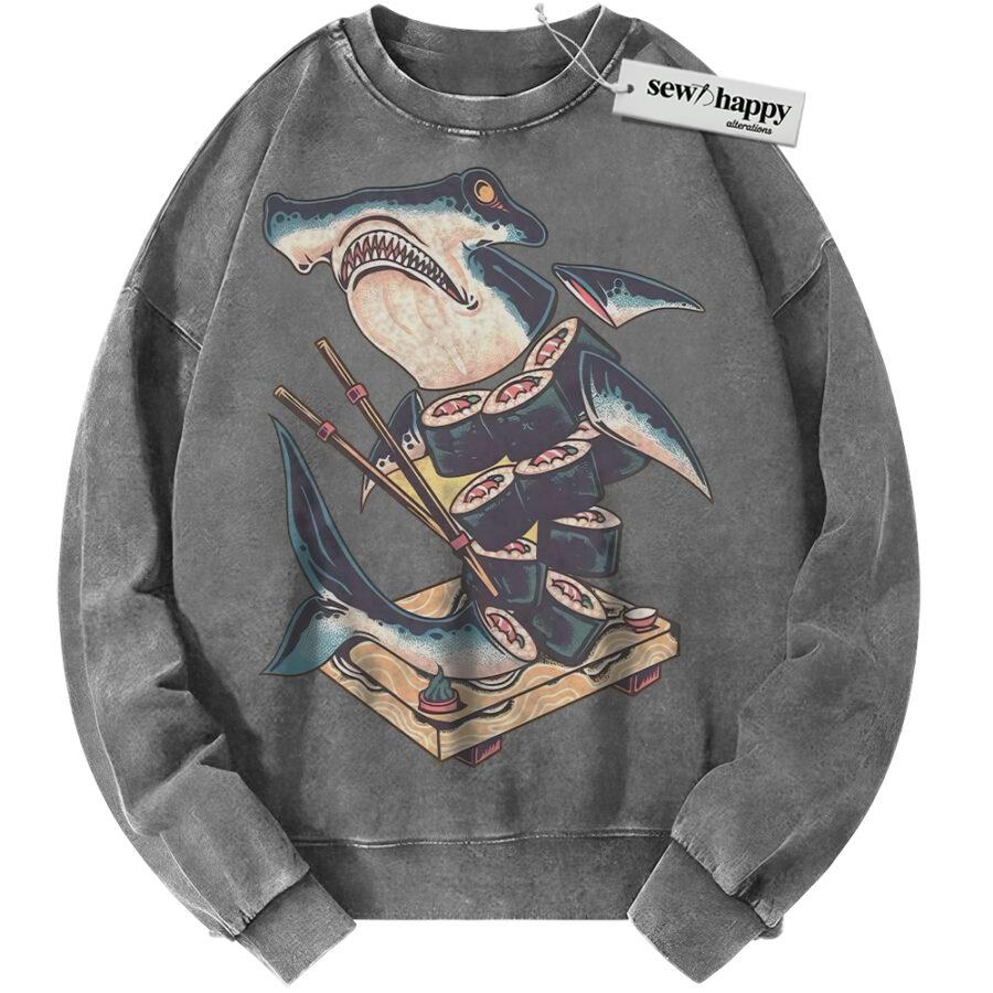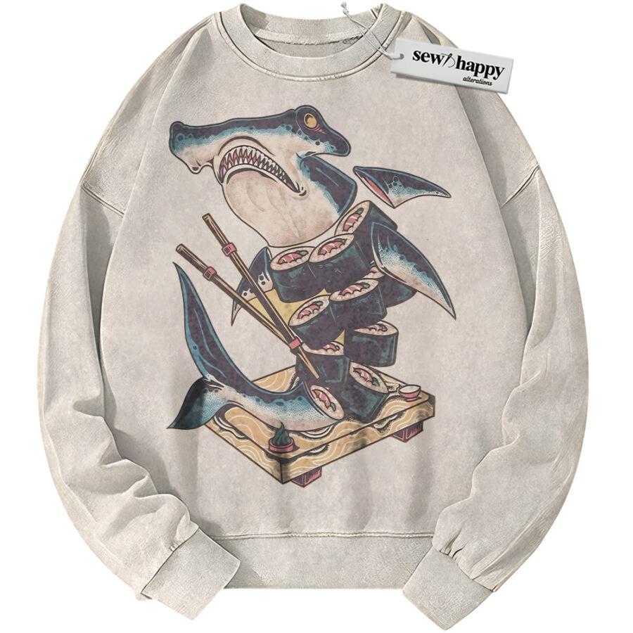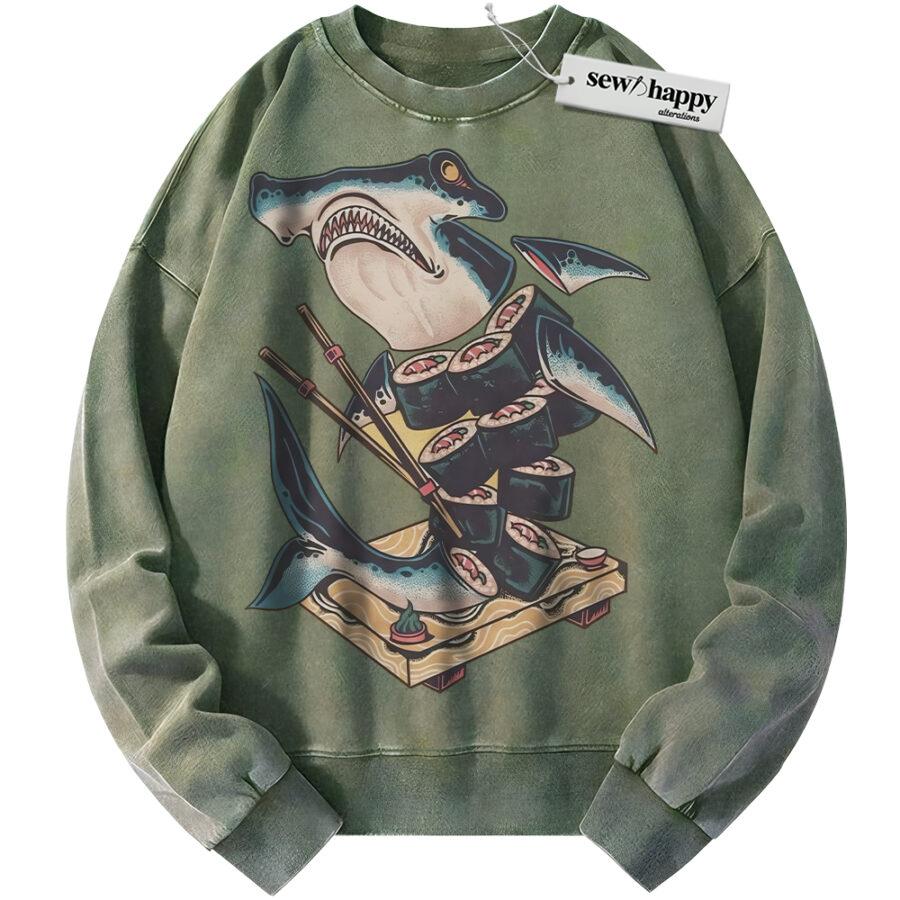 Wash Sweatshirt Sushi Shark Sweatshirt, Japanese Streetwear Sweatshirt, Vintage Sweater