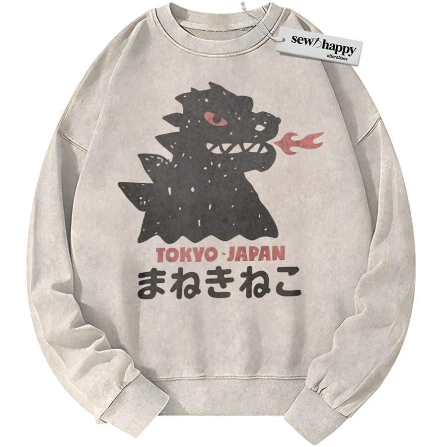 Wash Sweatshirt Tokyo Japan Kaiju Sweatshirt, Japanese Streetwear Sweatshirt, Vintage Sweater